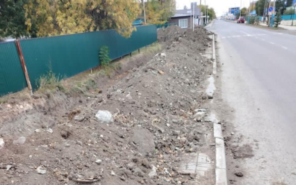 Эта земля с весны лежит. Неоднократно обращались в акимат . Сдвигов нет. Отписываются, что идут судебные дела. Это дорога в школу. Уберите землю с тротуара, а потом судитесь с кем хотите! Аким области приезжал — закопали, он уехал — опять раскопали…