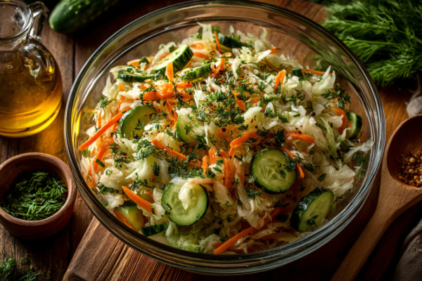 Для приготовления понадобится: 1,5 кг белокочанной капусты, морковь, свежий огурец, 0,5 ч. л. соли, 2 ст. л. сахара, 2 ст. л. уксуса (9%), растительное масло по вкусу, свежая зелень.