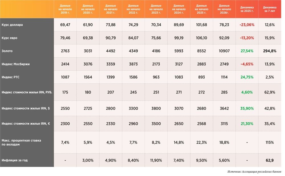 Индекс стоимости жилья за последние семь лет рос соразмерно общему росту цен. Фондовый рынок показал более скромные результаты: индекс Мосбиржи увеличился всего на 13,9%, а за прошлый год даже продемонстрировал небольшое снижение (на 4,6%). Индекс РТС показал ещё более скромный рост – лишь на 2,5%. По мнению АРБ, нестабильность рынка в 2025 г. привела к дальнейшему снижению доходности инвестиций.