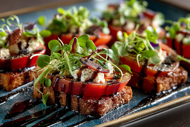 Эта закуска — маленькое произведение искусства. Внизу — сочный, яркий, слегка кисловатый фундамент из кружка помидора. На нём — кремовая, бархатистая «башня» из фасолевого паштета, утяжеленная крошкой грецких орехов. А зелёный лук сверху — как флаг, завершающий композицию. Каждый слой играет свою роль в текстуре и вкусе.