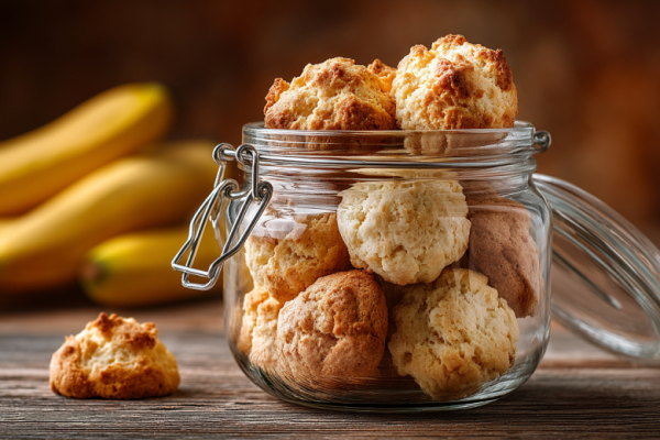 Для приготовления понадобится: 2 крупных спелых банана, 150 г творога (жирностью 5-9%), 50 г размягченного сливочного масла или 2 ст. л. растительного масла, 100 г сахара, 1 яйцо, 250 г муки, 1 ч. л. разрыхлителя, щепотка соли, ванилин или корица по желанию. Разомните бананы в пюре вилкой. В глубокой миске творог смешайте с мягким маслом и сахаром до однородности. Добавьте яйцо, банановое пюре, соль, ванилин и перемешайте. Муку смешайте с разрыхлителем и постепенно введите в жидкую основу, замешивая мягкое, липкое тесто. Разогрейте духовку до 180°C. Противень застелите пергаментом. Влажными руками сформируйте небольшие шарики из теста, выложите на противень и слегка приплюсните. Выпекайте 15-20 минут до лёгкого румянца по краям. Серединка может казаться чуть влажной.