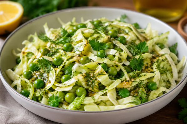 Лёгкий, хрустящий и при этом насыщенный вкусом салат, который идеально подходит для весны. Капуста даёт сочную основу, зелёный горошек добавляет нежную сладость, а горчичная заправка с лимонной кислинкой делает вкус ярким и запоминающимся.