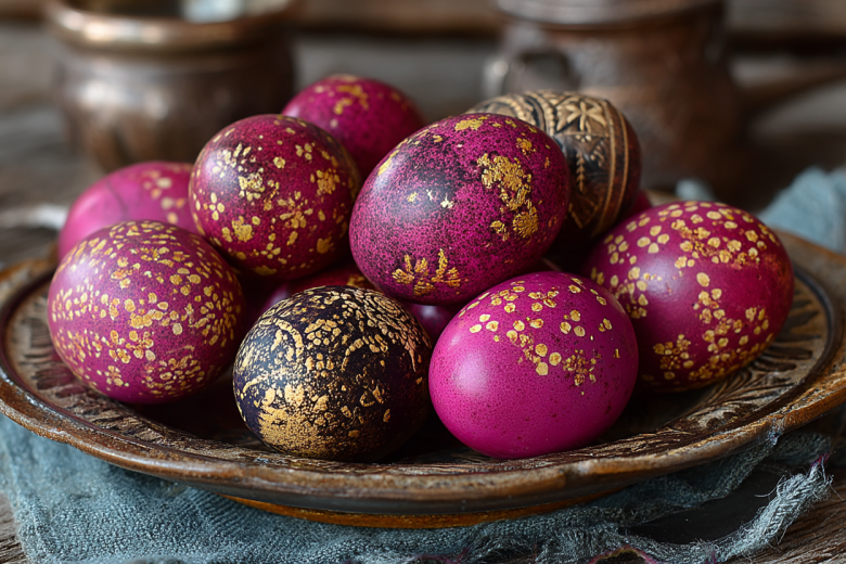 Красивые яйца к Пасхе — мечта многих хозяек. Луковая шелуха и каркаде часто дают непредсказуемый результат: то бурый, то серый оттенок, а иногда и вовсе грязно-зеленый. Предлагаю сотворить что-то действительно красивое и поднять настроение в светлый праздник. Сырая свекла и золотая поталь — вот и весь секрет. Этот способ удивительно прост, не требует варки в отварах и многочасового томления. Все гениальное действительно просто.