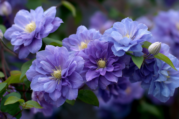 Цветет дважды: первый раз обильно в мае-июне на прошлогодних побегах, формируя крупные махровые цветки до 15 см в диаметре сиренево-голубых или розоватых оттенков со светло-желтыми тычинками. Второй раз — в августе-сентябре на побегах текущего года, но цветки уже простые. Это делает «сиренелию» особенно декоративной в течение всего сезона. Растение устойчиво к болезням, относится ко второй группе обрезки (лёгкая обрезка после первого цветения). Посадите этот клематис — и он станет жемчужиной вашего сада, радуя глаз нежными сиреневыми звёздами.