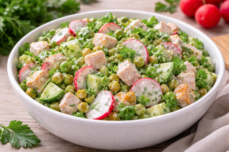 Консервированный горошек — 0,5 банки, копченая курица — 100 г, редис — 3 шт., свежий огурец — 1 шт., пучок зелени (укроп, петрушка) — 1 шт., сметана или майонез — по вкусу, соль и перец — по вкусу.
